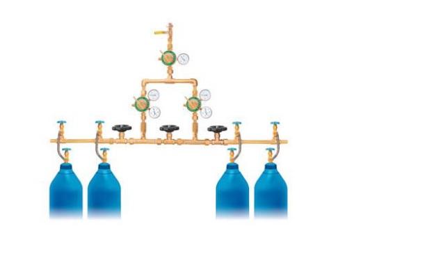 中心供氧系統(tǒng)匯流排的組成部分有兩種,一根是左匯流主管道,另一根是右匯流主管道,中間有四只高壓閥門,分別控制左右兩組匯流管,每組有相當(dāng)數(shù)量的分閥,軟管及卡具連接氣瓶,中間裝有一塊高壓表,用來檢測(cè)匯流管內(nèi)的壓力,高壓閥門上方分別有兩組減壓器,以便控制調(diào)節(jié)使用壓力及流量。